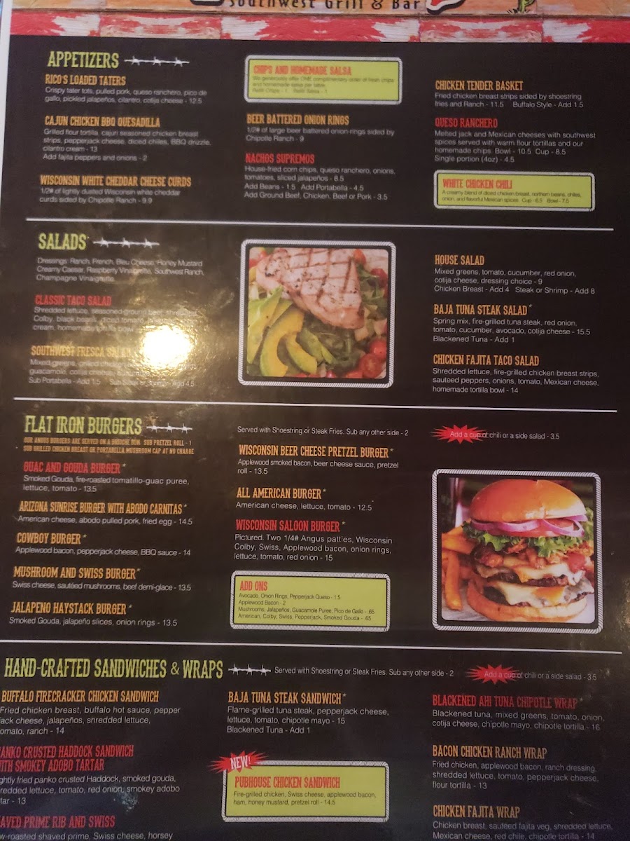 Welcome to Tucson's Southwest Grill & Bar, a gem nestled in Green Bay, WI. Here, Tex-Mex and Southwest flavors intertwine, creating a vibrant dining experience that keeps guests coming back. The menu features mouthwatering dishes like the famed BBQ ribs, perfectly tender and rich in flavor, paired wonderfully with their renowned cheese curds, made fresh daily. Savannah, the friendly server, is known for her expert recommendations, such as the Wisconsin pretzel burger and the delectable Chimichanga enhanced with a fresh seafood lobster sauce. This attention to detail reflects Tucson’s commitment to quality ingredients and memorable meals. Also, don't miss out on the best margaritas in town—a local favorite that complements any dish and makes for a perfect date night spot. The inviting ambiance, coupled with excellent service, guarantees an enjoyable time for families and friends alike. Tucson's Southwest Grill & Bar isn't just a meal; it’s an experience worth savoring.